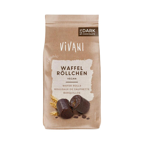 BIO ČOKOLADNE VAFELJ ROLICE, vegan, 125 g - Sestavine: pšenična moka*, surovi trsni sladkor*, kakavova masa*, pesin sladkor*, kakavovo maslo*, emulgator: lecitini* (sojin*), kokosova maščoba*, cimet*, morska sol. *iz ekološke pridelave. Lahko vsebuje sledi lupinastega sadja in mleka. Hranilna vrednost na 100g: energijska vrednost: 2010kJ/480kcal, maščobe 22g -od tega nasičene maščobe 12g, ogljikovi hidrati 62g -od tega sladkor 38g, beljakoviene 5,8g, sol 0,3g. Hraniti na hladnem in suhem. Kmetijstvo EU/izven EU. Uporabno najmanj do: odtisnjeno na zadnji strani embalaže. Dobavitelj: KLASA d.o.o., Železniška ul. 5, Lesce.