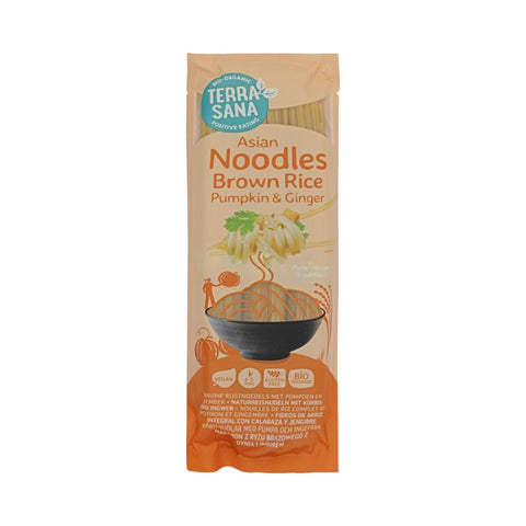 Bio polnozrnati riževi rezanci z okusom buče in ingverja za pripravo vseh vrst azijskih jedi. Brez glutena.